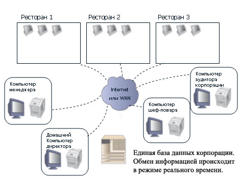 - Нет необходимости держать специально обученный персонал в каждом из заведений для управления базой данных и обслуживания системы - все настройки могут выполняться с любого из компьютеров, в т.ч. с сервера базы данных, на котором зарегистрирован пользователь с соответствующими правами доступа
